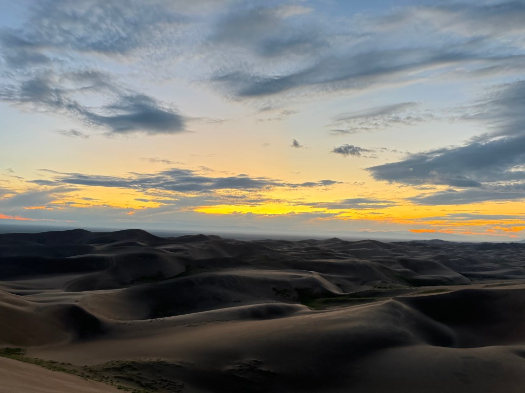 This was our last full day in Colorado and we spent the morning chilling out, watching tv, and playing DnD. We then made sandwiches and packed snacks for the three hour drive to the sand dunes. The drive brought a lot of rain. We were very unsure how this hike would happen. When we got to the sand dunes, at around 6p.m., the sky opened up! We parked by the trail head, use the restroom , and got bitten up by bugs. We then started the hike and let me tell you it was a short hike but so difficult. Walking up mountains of sand on a steep incline is not easy. I had to take a break almost every minute. But we eventually made it to the top of the Great Sand Dune and the view was stunning! I can easily say it was the most beautiful view I have ever seen.
